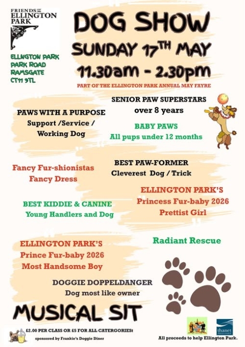 DOG SHOW – Starts at 1:30PM (£2 entry) - Rosettes for 1st–3rd place winners! Categories include Most Handsome * Prettiest Female * Best Rescue * Gentle Giant * Small & Sassy
